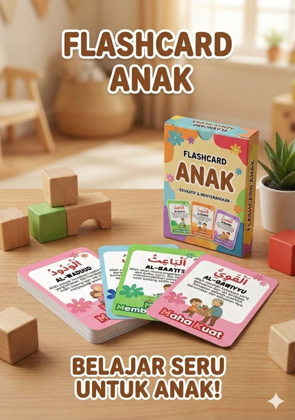 Flashcard anak itu sederhana sekali. Kartu kecil dengan gambar dan kata. Isinya bisa macam-macam: huruf, angka, hewan, buah, warna, bentuk, aktivitas sehari-hari, hingga materi-materi pendidikan agama seperti flashcard asmaul husna.